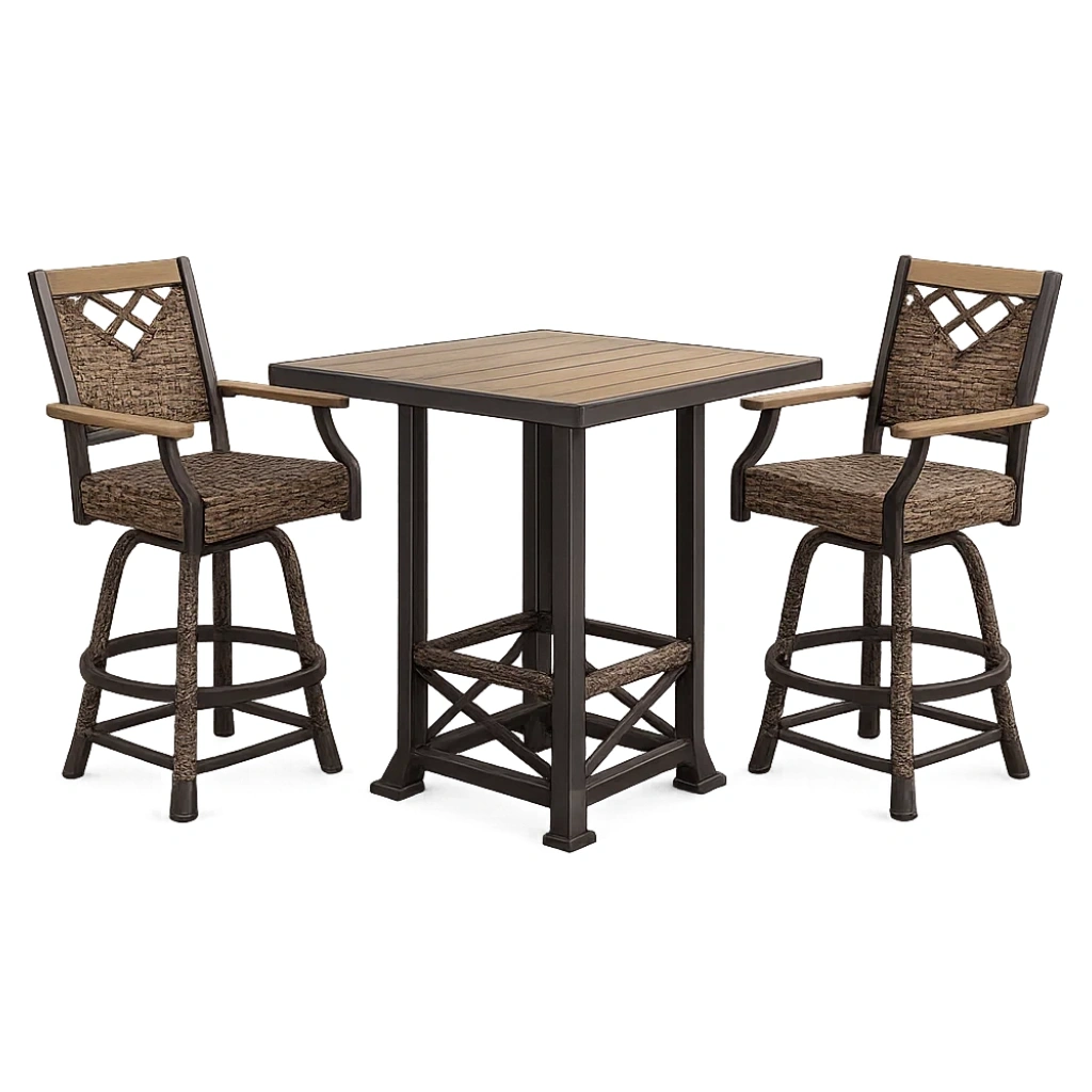 Ensemble de bar en aluminium et résine marron avec table carrée et chaises hautes