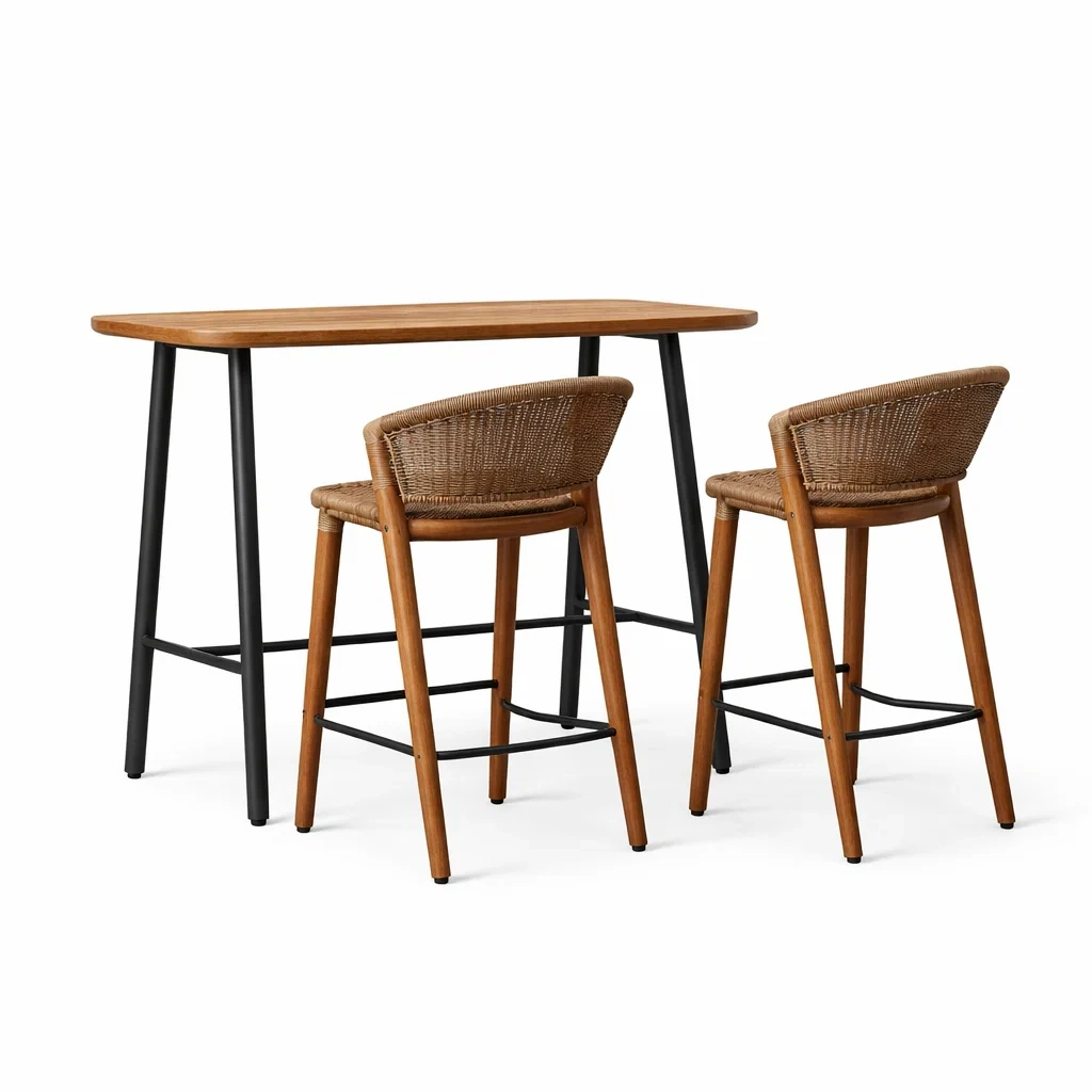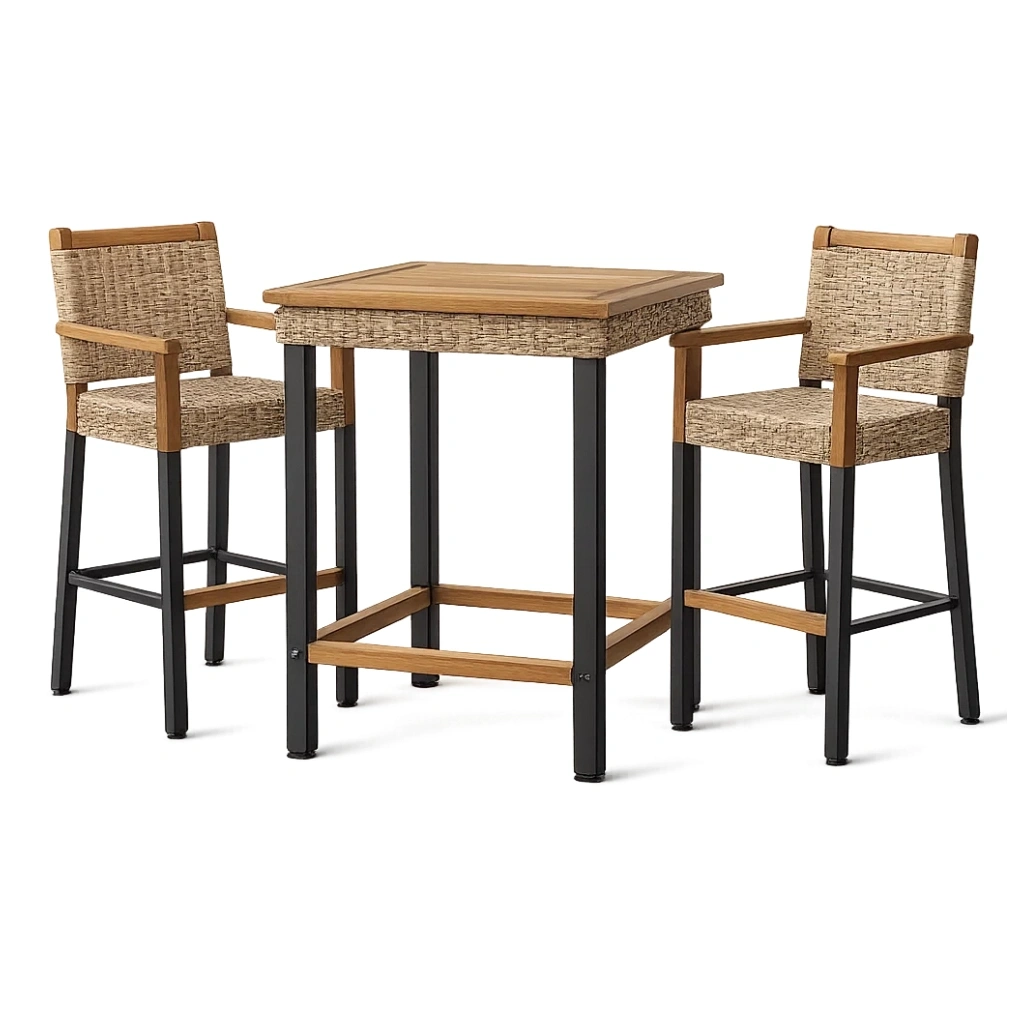 Ensemble de bar en acacia et rotin avec piètement métallique noir